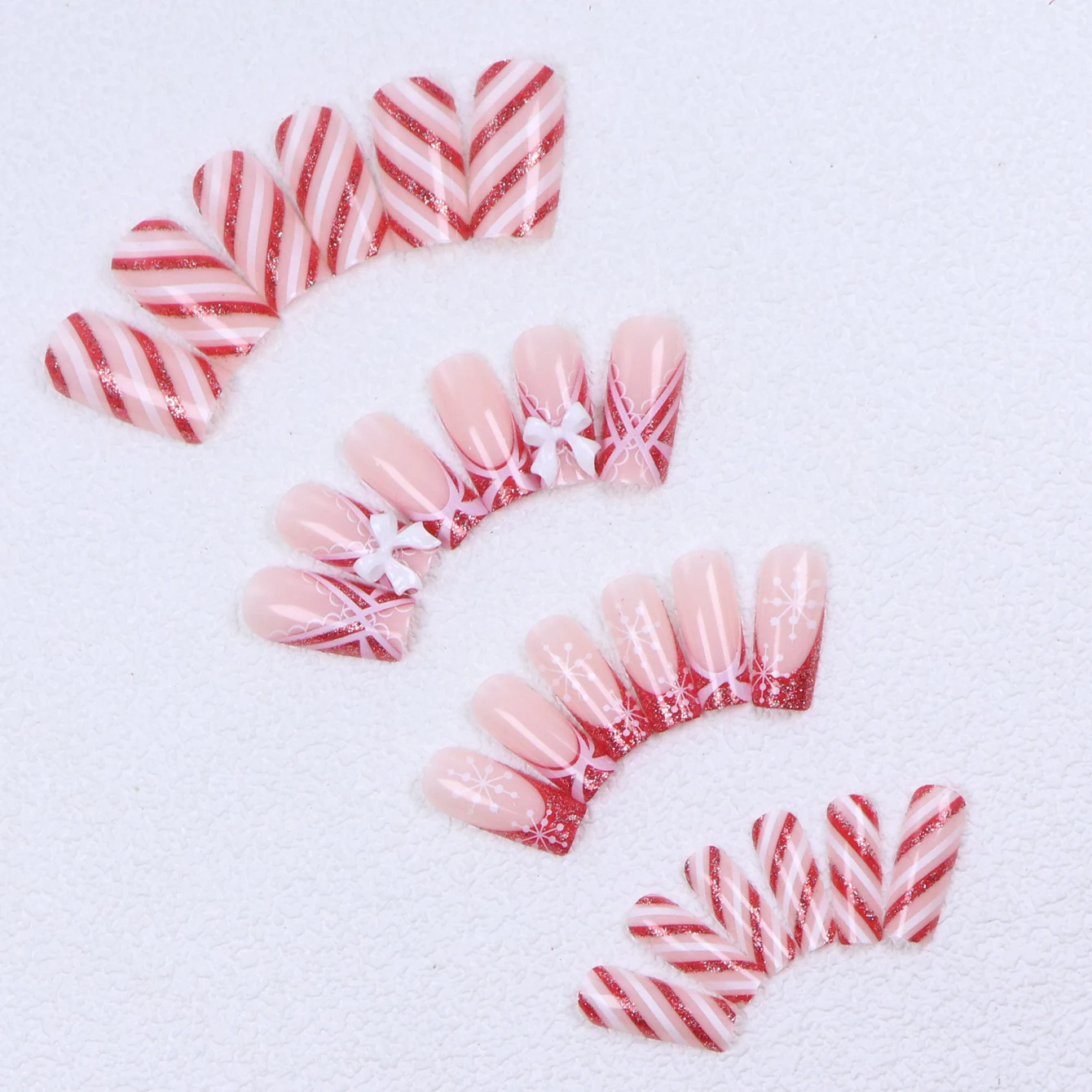 Christmas Nail Long French Pointed Square Fake Nail Snowflake Bow Design Fully Covered 24PCS Acrylic Christmas Fake Nail