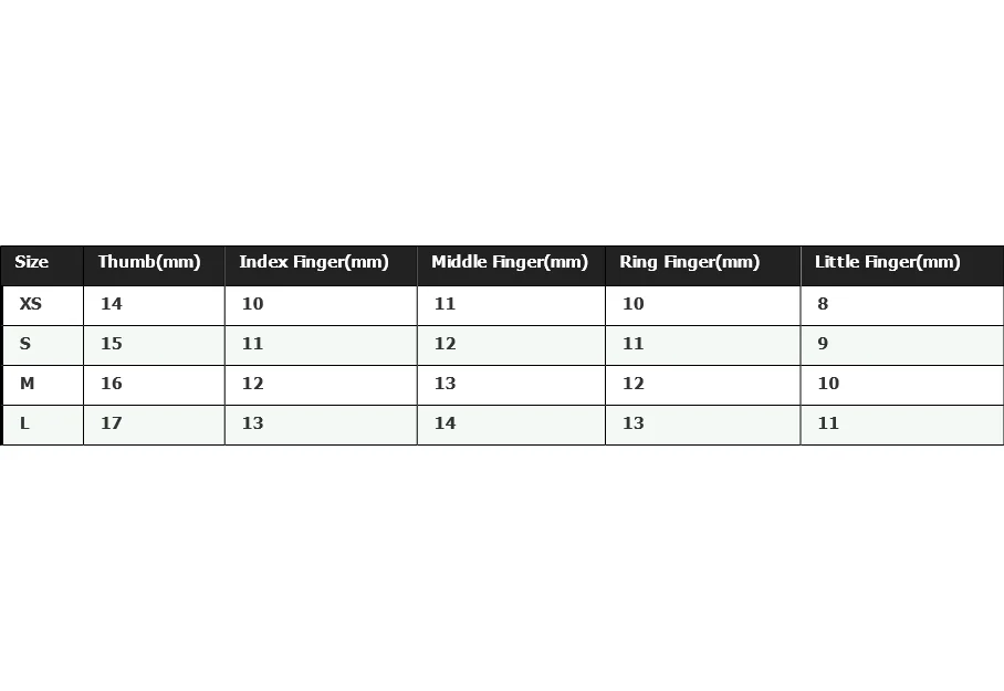 Size,Thumb(mm),Index Finger(mm),Middle Finger(mm),The Fourth Finger(mm),Little Finger(mm)