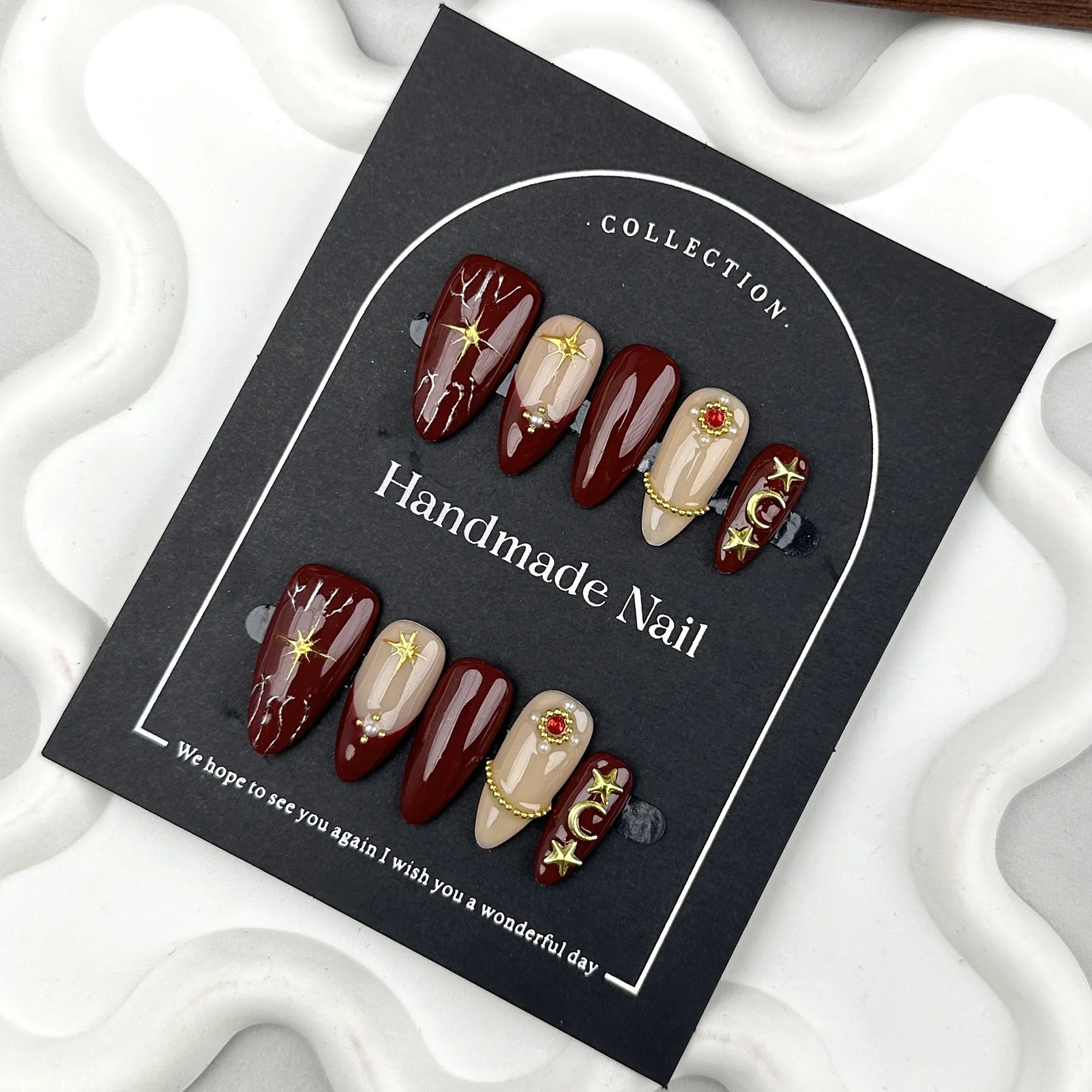 10pcs Nude Wine Red Press On Nails With Pearl Star Moon Shaped Almond Fake Nails For Women And Girl Nail Salon Detachable
